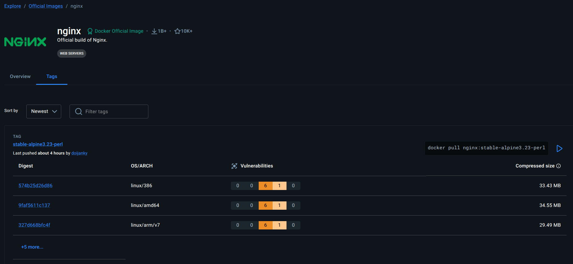 If you look at the OS/ARCH column, you can clearly see that the same NGINX tag has multiple architecture-specific variants, including: