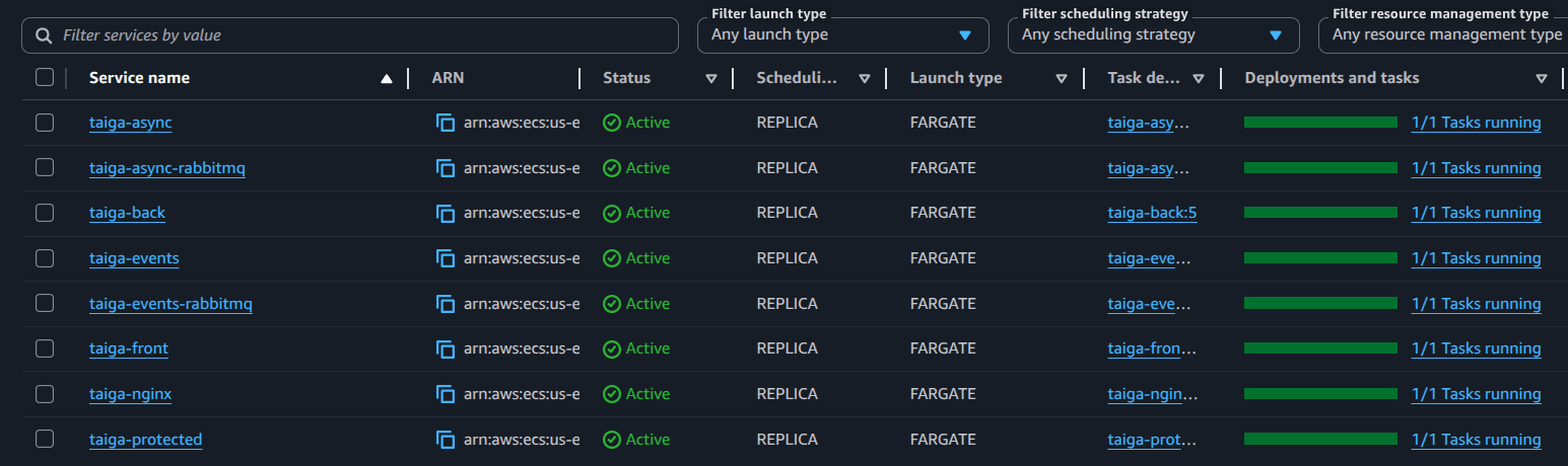 After verifying that Taiga ran correctly locally, I mapped the Docker Compose setup to AWS ECS Fargate. Each service became its own ECS task, allowing independent scaling and management: