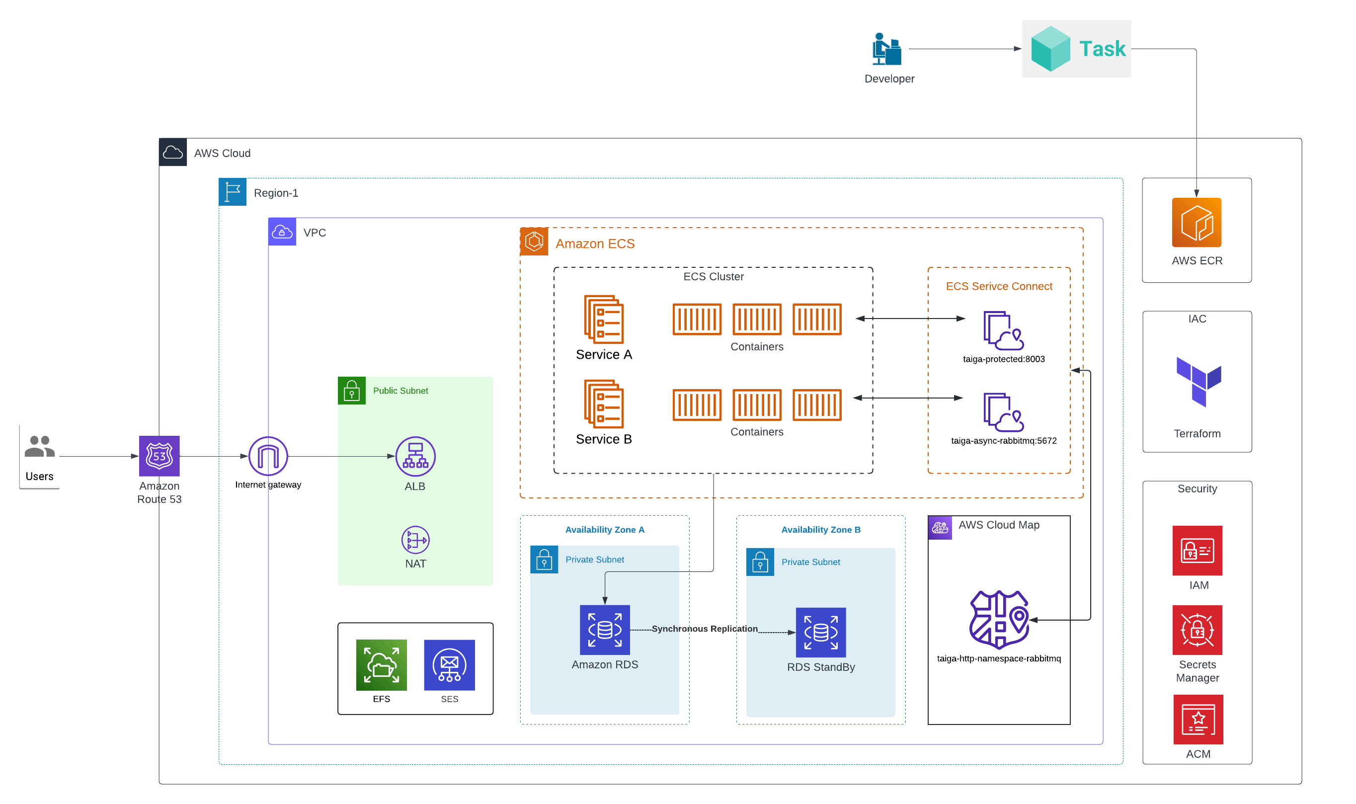 The ECS cluster uses Fargate launch type, removing the need to manage EC2 instances. Services are deployed behind an Application Load Balancer (ALB) for routing HTTP/HTTPS traffic, with taiga-nginx handling frontend proxying. All ECS services run in private subnets, while the ALB is placed in public subnets to handle external traffic. Internal service-to-service communication occurs entirely within the private network, ensuring secure and efficient connectivity.